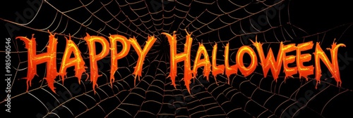 The watermark will not be included on Wall mural.: 3d orange text "happy halloween" with spider web isolated on black background generative ai