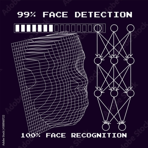 Wall mural 3d polygonal face made of mesh on a dark background and pixelated text "99% face detection". concept - Wall murals Wall mural 3d polygonal face made of mesh on a dark background and pixelated text "99% face detection". concept - Wall murals