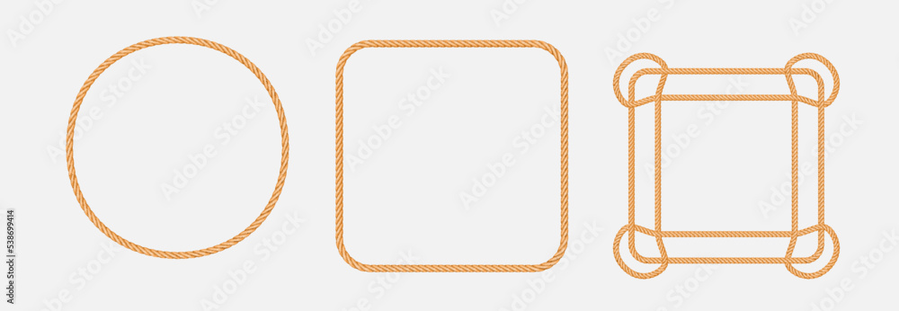 3d realistic square and round frames from ropes - jute or hemp twisted cords with loops and knotsWall mural