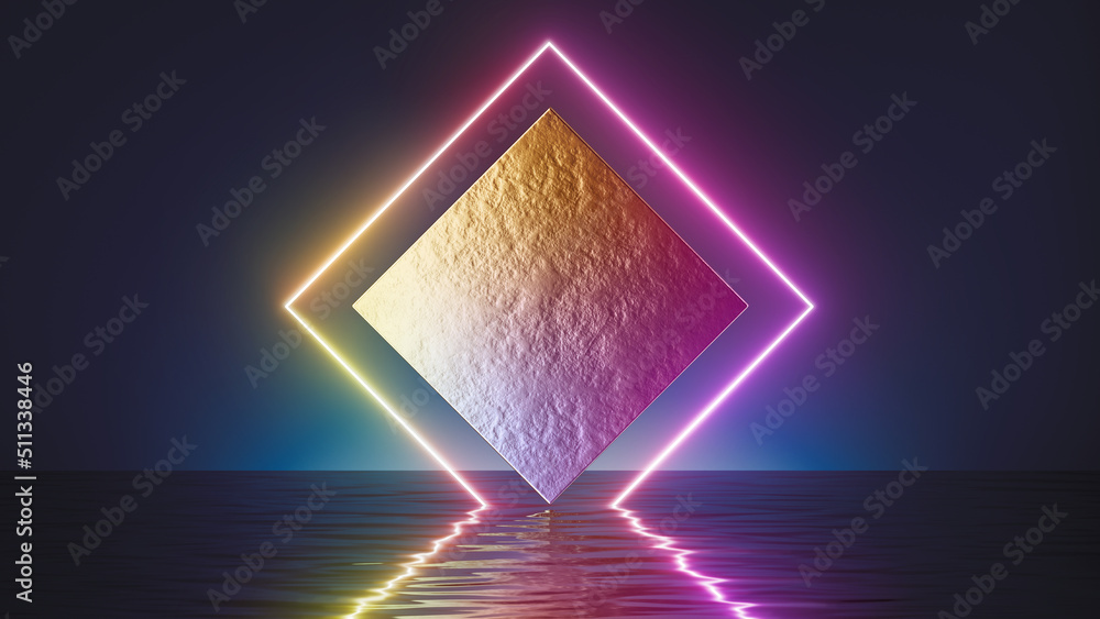 Wall mural 3d render, abstract background with neon rhombus frame and blank square rock tile standing in the wa - Wall murals Wall mural 3d render, abstract background with neon rhombus frame and blank square rock tile standing in the wa - Wall murals