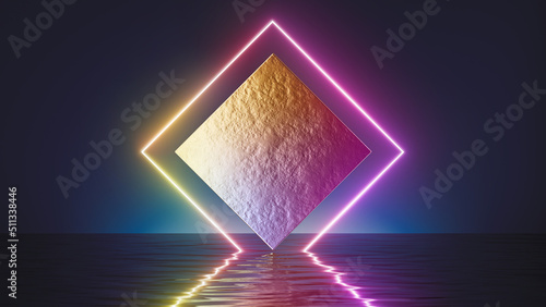 Wall mural 3d render, abstract background with neon rhombus frame and blank square rock tile standing in the wa