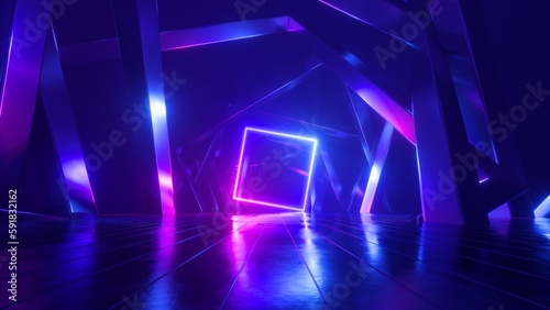 The watermark will not be included on Wall mural.: 3d render, abstract blue pink background with glowing neon square frame - laser geometric linear shap