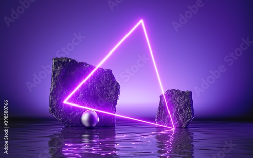 The watermark will not be included on Wall mural.: 3d render, abstract futuristic background with neon triangular frame, black cobble rocks and reflect