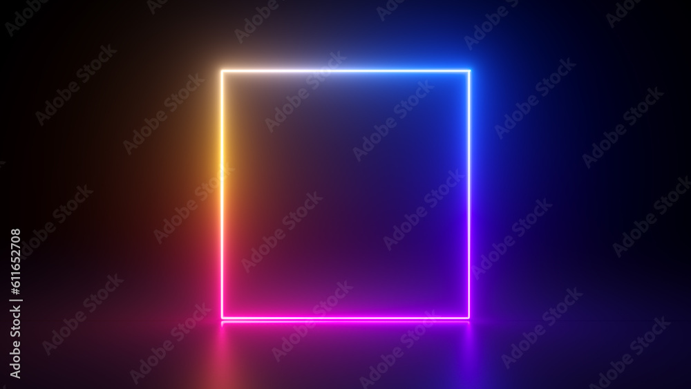 The watermark will not be included on Wall mural.: 3d render, abstract geometric background with neon square frame glowing with gradient light in the d