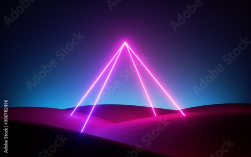 Wall mural 3d render, abstract pink blue neon background with glowing pyramid in the middle of the empty desert