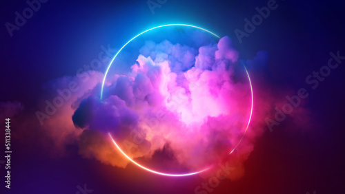 Wall mural 3d render, colorful neon ring glowing inside the stormy cloud on the dark sky, abstract background