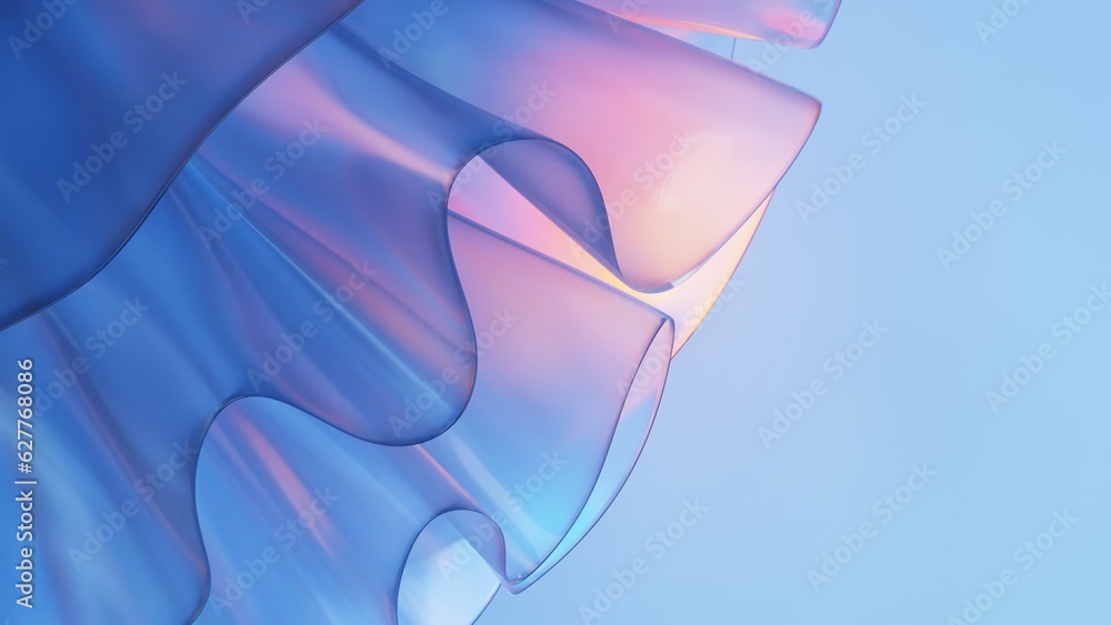 The watermark will not be included on Wall mural.: 3d render close up of abstract light blue curve emitter glass with multi color gradient