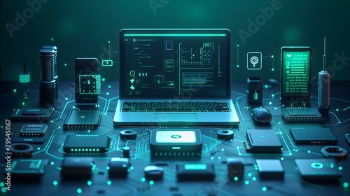 The watermark will not be included on Wall mural.: 3d render of a computer monitor displays a complex network of wires and devices,digital and technolo