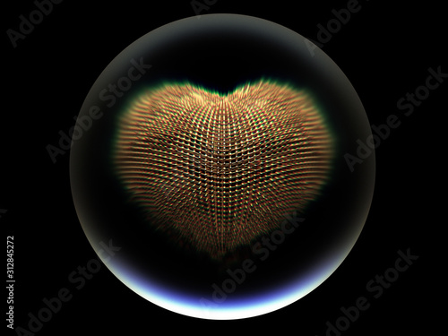 The watermark will not be included on Wall mural.: 3d render of abstract golden heart in wire structure with small glass and gold balls in big glass ma
