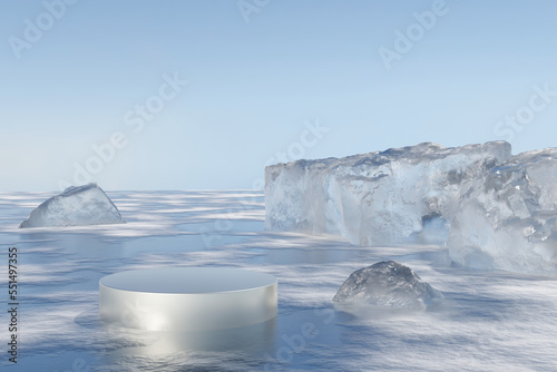 3d render platform and ice podium background on snow ground with ice rock and stone in winter for prWall mural