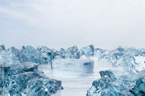 The watermark will not be included on Wall mural.: 3d render platform background and empty round stage, ice podium on the frozen lake with ice rock in