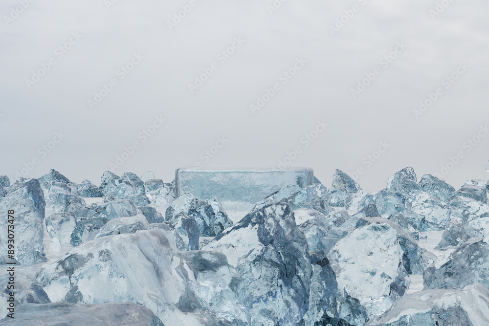 The watermark will not be included on Wall mural.: 3d render platform background and empty round stage, ice podium on the ice rock in winter for produc