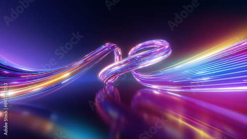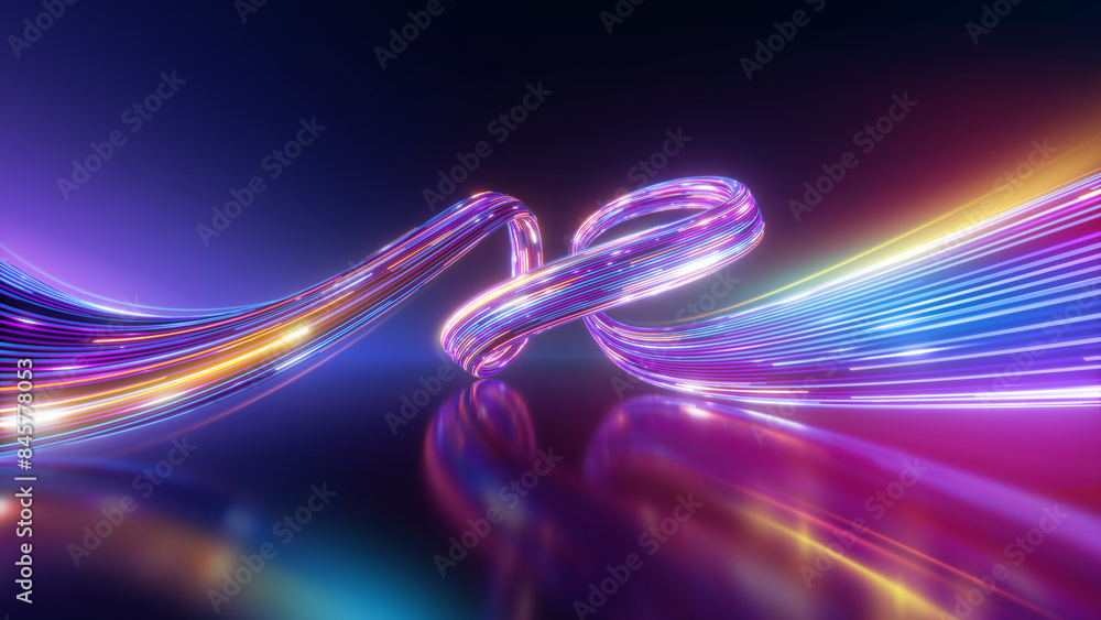 The watermark will not be included on Wall mural.: 3d render - abstract futuristic background of dynamic neon lines glowing in the dark, floor reflectio
