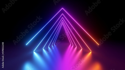 Wall mural 3d render. abstract geometric neon background. triangular shape. colorful lines glowing in the dark.