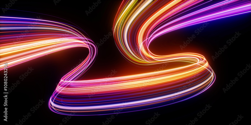 The watermark will not be included on Wall mural.: 3d render - abstract neon background - dynamic lines glowing in the dark with floor reflection - colorf