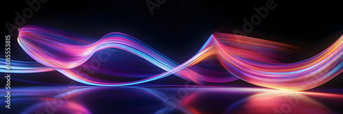 The watermark will not be included on Wall mural.: 3d render - abstract panoramic background of looped dynamic neon lines glowing in the dark room with