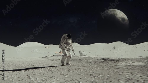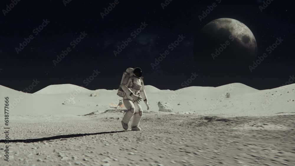 The watermark will not be included on Wall mural.: 3d rendered animation of an astronaut on the moon with a planet in the dark space background
