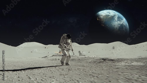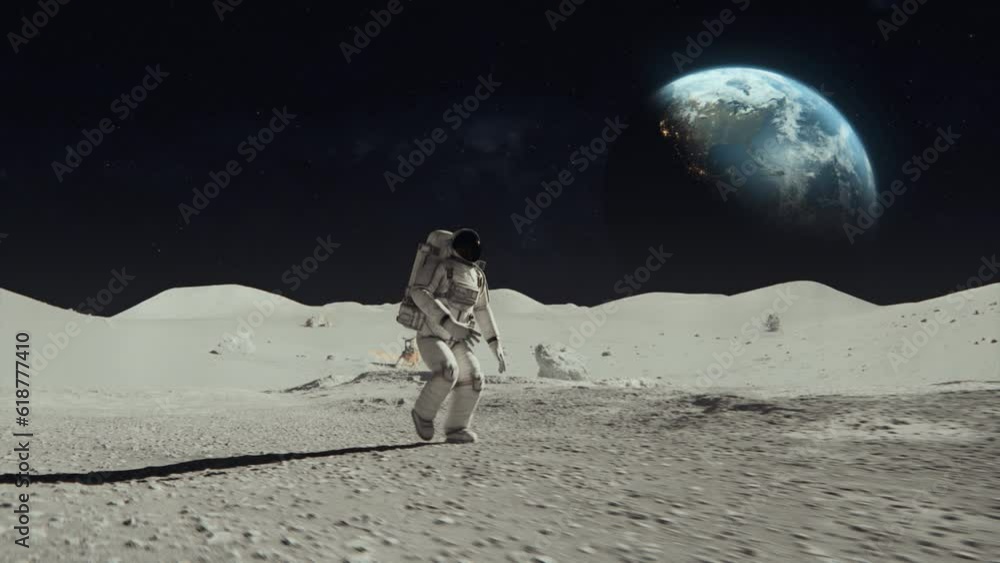 The watermark will not be included on Wall mural.: 3d rendered animation of an astronaut on the moon with the earth in the background