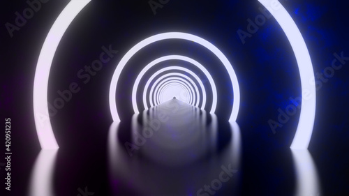 Wall mural 3d rendering, loop motion of glowing neon ring and on dark galaxy star background. neon light abstra