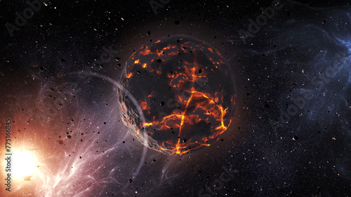 Wall mural : 3d rendering- dying planet with asteroids in deep space cinematic view of dead planet