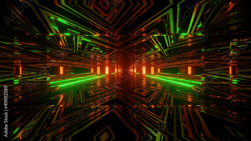 Wall mural 3d rendering futuristic sci-fi background with neon lights and reflective tunnel motion patterns