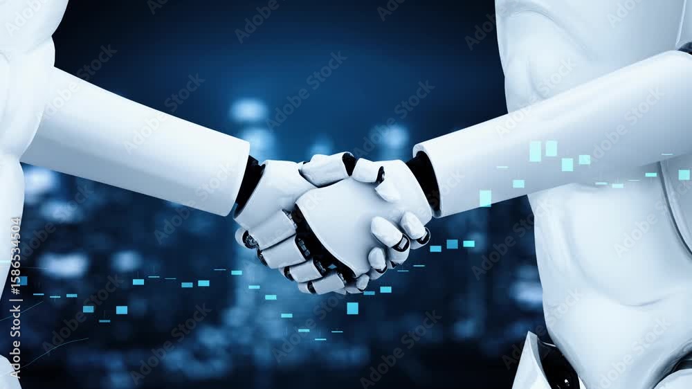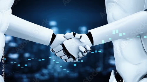 Wall mural 3d rendering hominoid robot handshake with stock market trading chart showing buy and sell decision  - Wall murals Wall mural 3d rendering hominoid robot handshake with stock market trading chart showing buy and sell decision - Wall murals