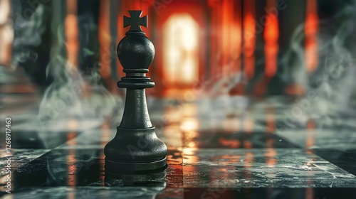 Wall mural 3d rendering of a black chess piece on a chessboard. the background is out of focus and there is a s - Wall murals Wall mural 3d rendering of a black chess piece on a chessboard. the background is out of focus and there is a s - Wall murals