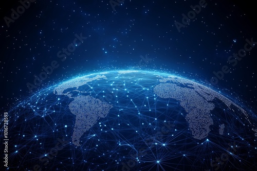 3d rendering of a glowy polygonal grid planet on dark background - globe, international map, communicWall mural