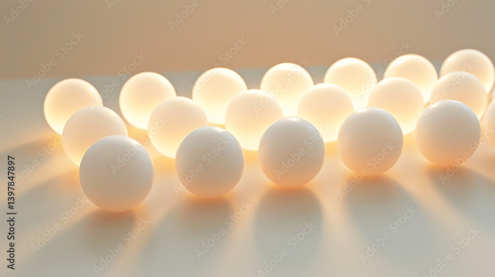 The watermark will not be included on Wall mural.: 3d rendering of a group of glowing white spheres on a reflective surface -