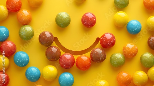 The watermark will not be included on Wall mural.: 3d rendering of a yellow background with a smiley face made of colorful candy -