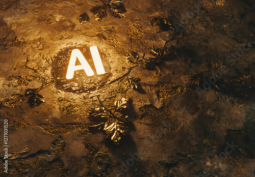 3d rendering of an "ai" logo on top, close-up view of the mainboard with a chip and integrated circuWall mural