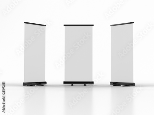 Wall mural : 3d rendering of blank vertical rollup (empty billboard advertisement) isolated on white background -