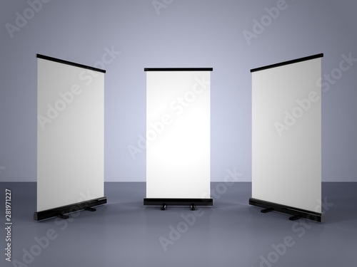 Wall mural : 3d rendering of blank vertical rollup (empty billboard advertisement) on gray background - empty mock