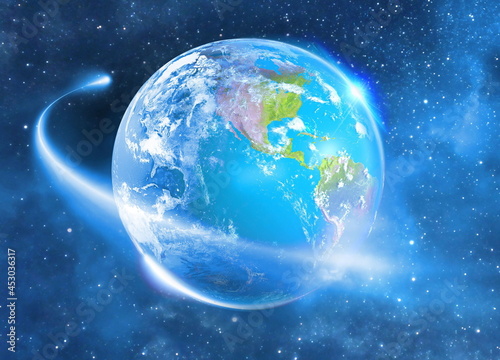 Wall mural 3d rendering of comet moving passing planet earth high definition universe field with stars, galaxy  - Wall murals Wall mural 3d rendering of comet moving passing planet earth high definition universe field with stars, galaxy - Wall murals