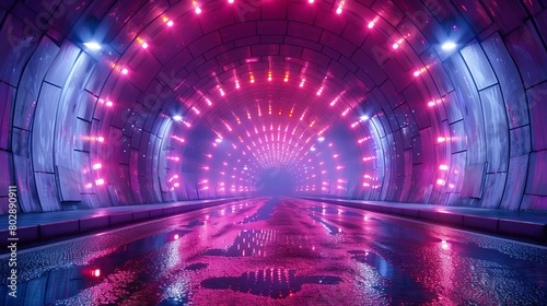 3d rendering of curved tunnel with led glowing lights on ceiling and reflection from puddle on wet dWall mural