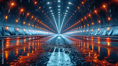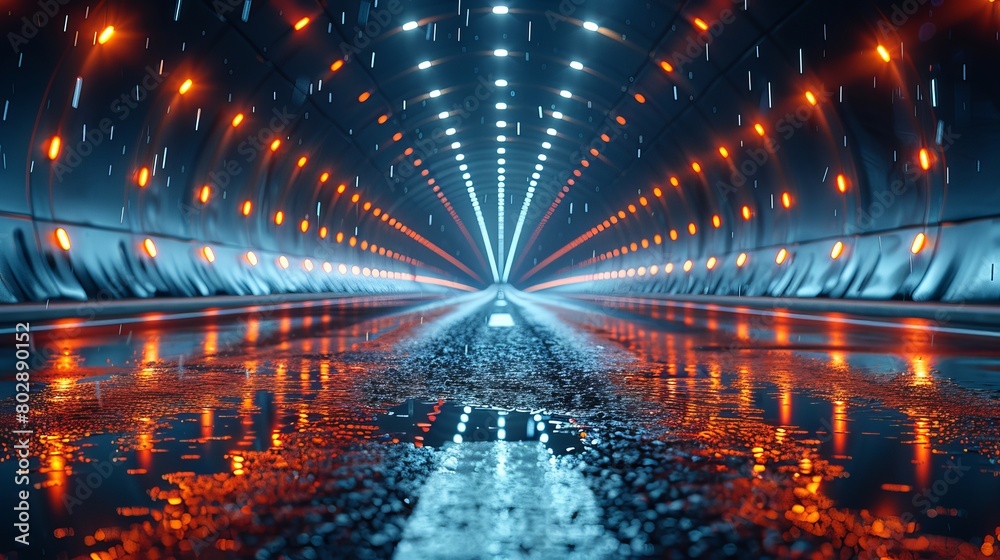 3d rendering of curved tunnel with led glowing lights on ceiling and reflection from puddle on wet dWall mural