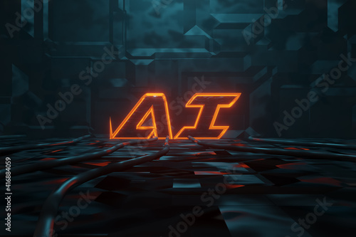 Wall mural 3d rendering of cyberpunk word ai, artificial intelligence illuminated in orange in metal background