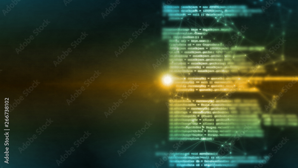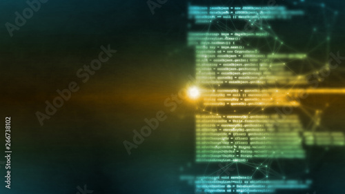 Wall mural 3d rendering of digital abstract technology. programming script binary coding snippet on glowing sof
