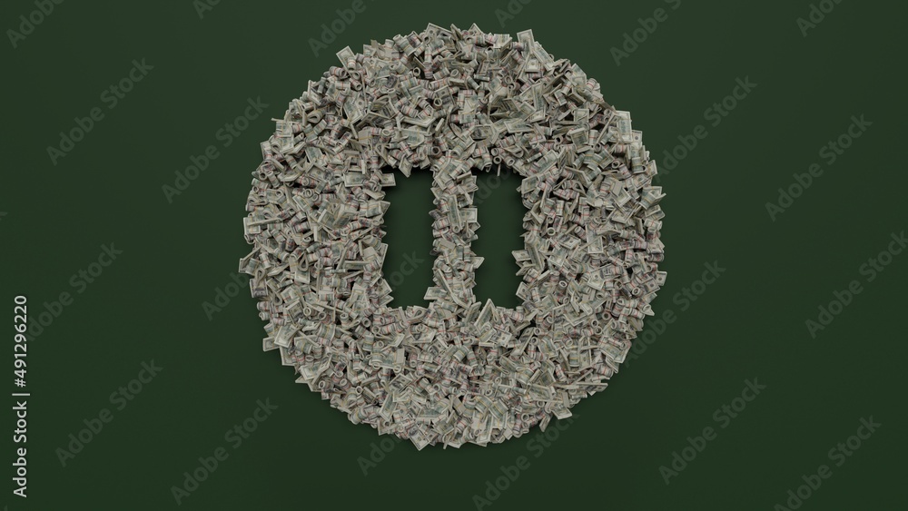 3d rendering of dollar cash rolls and stacks in shape of symbol of pause circle on green backgroundWall mural