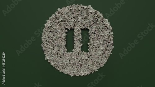 Wall mural : 3d rendering of dollar cash rolls and stacks in shape of symbol of pause circle on green background