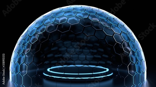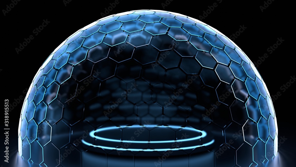 3d rendering of futuristic pedestal surround with hexagon grid sphere nano shield with glowing edge Wall mural