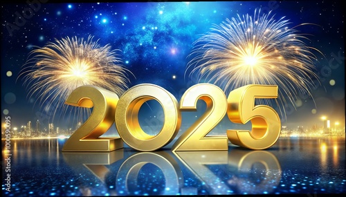 The watermark will not be included on Wall mural.: 3d rendering of golden light shine particles bokeh over red background and the numbers 2025 in gold