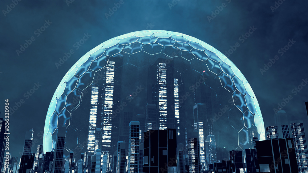 3d rendering of mega city being quarantine and protected with hexagon grid sphere nano shield with gWall mural