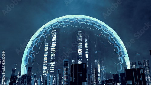 Wall mural : 3d rendering of mega city being quarantine and protected with hexagon grid sphere nano shield with g