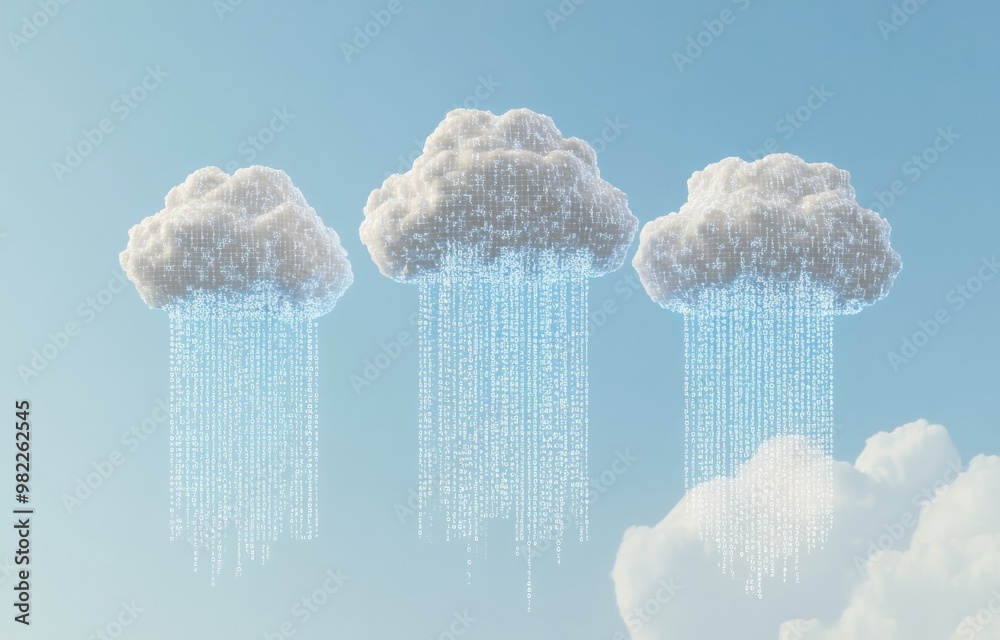 Wall mural 3d rendering of three white clouds with binary code rain falling. blue sky background - Wall murals Wall mural 3d rendering of three white clouds with binary code rain falling. blue sky background - Wall murals