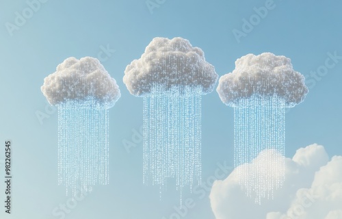 The watermark will not be included on Wall mural.: 3d rendering of three white clouds with binary code rain falling - blue sky background