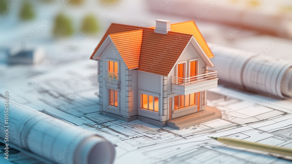 Wall mural 3d rendering project of new building model house on blueprint plan
