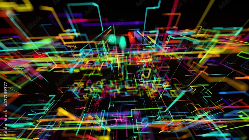 Wall mural : 3d rendering sci-fi bg like abstract hologram - multicolor neon glow lines form digital 3d space - con