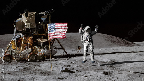 Wall mural : 3d rendering - astronaut jumping on the moon and saluting the american flag - cg animation - elements o