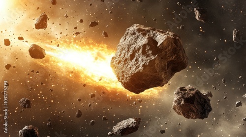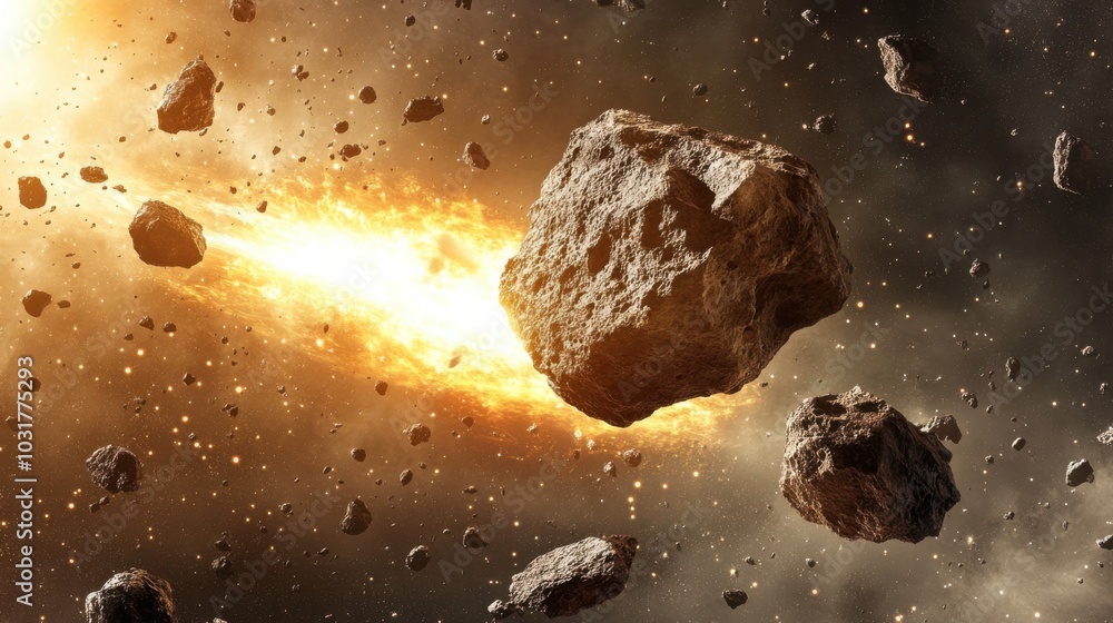 The watermark will not be included on Wall mural.: 3d spacecraft navigating through asteroid field
